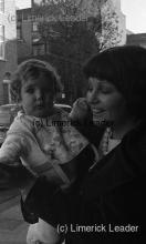 Geraldine Costello and baby outside Desmond Arms, May 1976